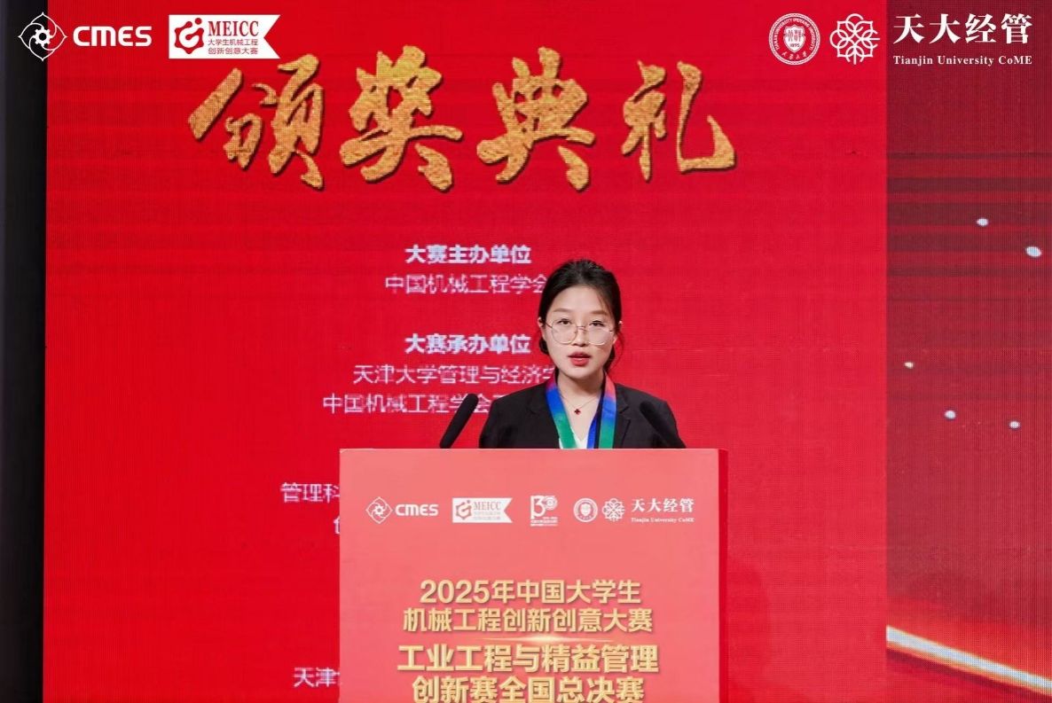 研究生王婷同学作为获奖选手代表发表感言。她对大赛执委会、各位评委和指导老师表达由衷的感谢,并表示“本次大赛为参赛师生提供了广阔的学习与交流平台,使大家在创新实践中深刻体会到工业工程的价值与魅力。在参赛过程中,团队不仅提升了跨专业协作能力与系统思维水平,更加坚定了服务国家高端制造业发展、投身航空强国建设的理想信念。”