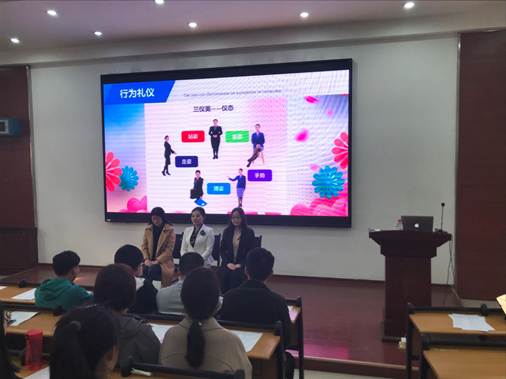 首先马老师对于求职礼仪的知识与重要性进行了讲解,并且带领大家做一些小游戏以及真实还原面试现场情形,同学们认真听讲,积极参与其中,在游戏与模拟情形中学习礼仪,感受礼仪的魅力。